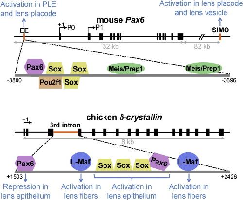 Fig. 3. Cis-regulation of mouse Pax6 and chicken δ-crystallin genes. For Pax6, only two enhancers active in the lens lineage, EE and SIMO, are shown, although this gene has other enhancers for other tissues, such as retina and diencephalon. The SIMO element is located approximately 82 kb downstream of the last exon of Pax6. Pax6 has two promoters, P0 and P1 (Xu et al., 1999b). In EE, the 5â²-most Sox-binding site overlaps with both Pou2f1- and the 2nd Sox-binding sites, and the 2nd Sox-binding site overlaps with the 3â²-most Sox-binding site. Meis1, Meis2 and Prep1 recognize the same binding sites. The lens enhancer of the δ-crystallin gene is located in the 3rd intron. This enhancer is activated in lens epithelial cells by Pax6-binding to the 3â² site, which depends on neighboring Sox2/Sox3-binding, as described in the main text. L-Maf-binding to the flanking sites strongly activate this enhancer in lens fiber cells ( [Ogino and Yasuda, 1998] and [Shimada et al., 2003]), whereas the 5â²-most Pax6-binding attenuates the enhancer activity (Muta et al., 2002).