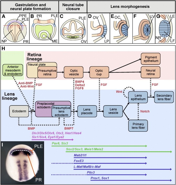 Fig. 1. Schematic illustration of vertebrate lens development, relationships between inductive interactions and sequential activation of transcription factors. (AâG) Xenopus was chosen as the vertebrate representative since its developmental lineages of lens, retina and other related tissues have been well studied ( [Eagleson and Harris, 1990] and [Eagleson et al., 1995]). The developmental stages are indicated at the top of the figure. (A) Dorsal view of a neural plate-stage embryo (anterior at the top of the image) indicating the preplacodal ectoderm (PPE, purple), the presumptive lensectoderm (PLE, dotted light blue), the neural plate (NP, light orange), and the presumptive retina field (PR, dark orange). (B) Transverse section of a neural plate-stage embryo through the PLE and PR. The red line in A indicates the plane of the section. Lens and retina lineages are shown in light blue and dark orange, respectively, in B-G, and mesoderm and endoderm (ME) are shown in light green. (C) Transverse section of a neural tube-stage embryo where the optic vesicle (OV), which develops from the PR, reaches the PLE. (D-F) Close-ups showing lens vesicle formation. The PLE overlying the OV becomes thickened to form the lens placode (LP), which subsequently separates from the headectoderm to form the lens vesicle (LV). OC, optic cup. (G) Close-up of a maturating lens. LE, lensepithelium; LF, lens fiber; NR, neural retina. (H) Major signaling factors are indicated in red with dotted gray arrows. FGF signaling from the neural retina is responsible for the formation of the secondary lens fibers from the lensepithelium (Lovicu and McAvoy, 2005). The other signaling pathways are explained in the text. At the bottom, Expression profiles of preplacodal genes, lens-specification genes and lens-differentiation genes (pink, green, and blue arrows, respectively) studied in Xenopus, zebrafish, chicken and mouse embryos. The dotted blue lines of FoxE3 and Pitx3 represent species differences in initial expression profiles. Details and references are described in the text. (I) In situ hybridization analysis of Pax6 expression in a neural plate-stage Xenopus embryo (dorsal view). The PLE and PR are indicated. The boundary between the neural plate and PPE is indicated by a white broken line. Note that preplacodal Pax6 expression occurs broadly adjacent to the anterior margin of the neural plate.