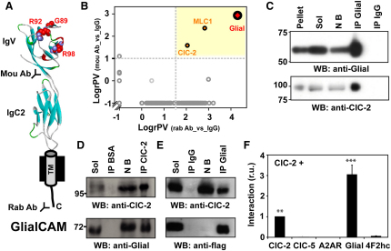 Figure 1. Identification of ClC-2 as a GlialCAM-Interacting Protein(A) Scheme of the GlialCAM molecule. Mutated residues studied in this work are depicted. Antibodies used for purification (mou: mouse; rab: rabbit) are shown.(B) Evaluation of GlialCAM affinity purification from mouse brain. The scheme shows a 2D plot of relative protein enrichment in affinity purifications versus IgG controls. Proteins specifically copurified are shown in the yellow area; dashed lines indicate the specificity thresholds as suggested by the distribution of all protein ratios (gray circles).(C), Immunoblot analysis of a sample of the affinity purification with the anti-GlialCAM rabbit polyclonal antibody stained with the same antibody (upper) and with anti-ClC-2 C1 antibody (lower); lanes resolve aliquots of pellet after solubilization, solubilizate (Sol), not bound (NB), or eluates from the purification (IP Glial). IP IgG: eluate from an IgG control.(D) Copurification of GlialCAM with anti-ClC-2 C2 antibody. Lanes were labeled as before.(E) Coimmunoprecipitation from HeLa cells transiently transfected with ClC-2 and Flag-tagged GlialCAM. Lanes were labeled as before.(F) Quantification of interaction using the split-TEV assay. ClC-2 was tested for interaction with the proteins indicated below the graph. ∗∗p < 0.01; ∗∗∗p < 0.001 versus 4F2hc.See also Figure S1.