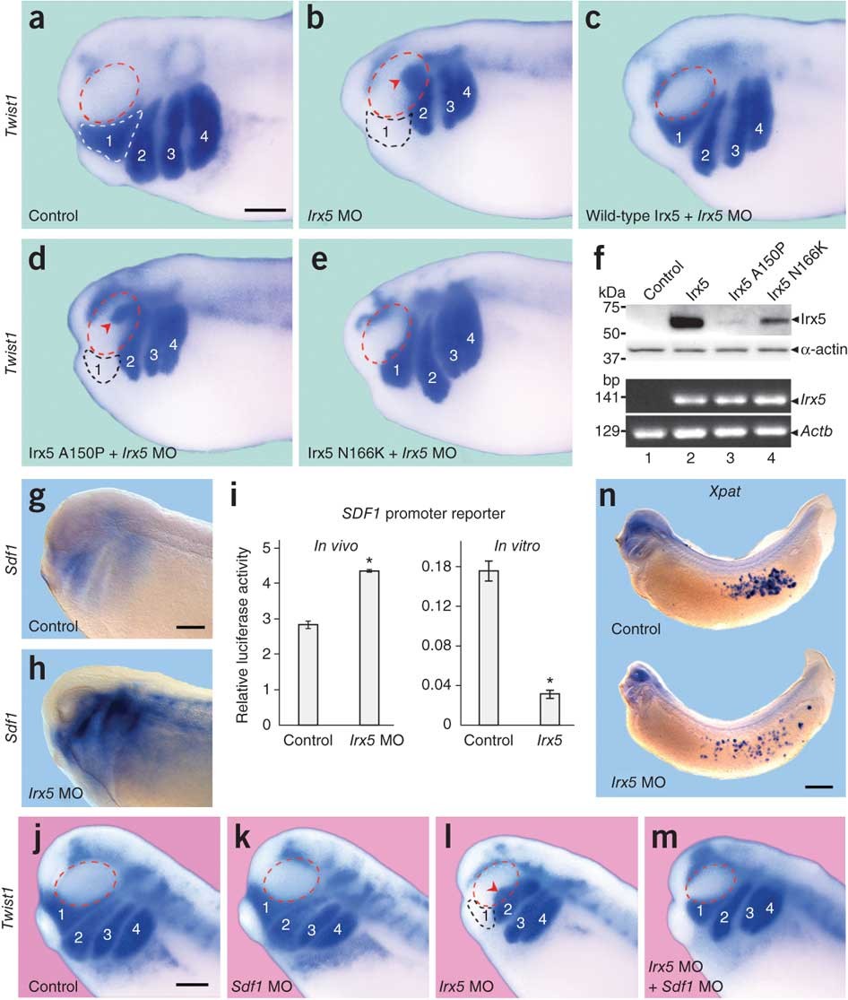 Figure 3: Irx5 orchestrates migration of cranial NCCs and primordial germ cells by repressing Sdf1 expression. (aâe) Cranial NCC migration patterns visualized by Twist1 expression in X. laevis embryos. Lateral view of head region of stage 26 embryos, anterior to the left. (a) Expression of Twist1 demarcated NCCs in four branchial arches (1â4; n = 36/36). Dashed red line outlines eye vesicle and dashed white line outlines first branchial arch. Scale bar, 0.25 mm. (b) Irx5 morpholino (MO)-injected embryos specifically lacked NCCs in first branchial arch (n = 23/38). Red arrowhead, ectopic NCC migration over eye vesicles. (c) Injection of wild-type mouse Irx5 DNA in Irx5 morphant embryos rescued NCC migration to first branchial arch (n = 30/40). (d) Injection of DNA encoding mouse Irx5 A150P in Irx5 morphant embryos did not rescue NCC migration to first branchial arch (n = 27/48). (e) Injection of DNA encoding mouse Irx5 N166K partially rescued NCC migration in Irx5 morphant embryos (n = 23/48). (f) Irx5 A150P protein was not detected in embryos injected with DNA encoding mouse Irx5 A150P compared to embryos injected with DNA encoding wild-type mouse Irx5. α-actin, loading control. Quantitative RT-PCR results show comparable transcription for each Irx5 DNA construct injected. Actb, positive control. (g,h) At stage 25, Sdf1 was markedly overexpressed in head region of Irx5 morphants relative to control embryos (n = 18/18). Scale bar, 0.25 mm. (i) Injection of a human SDF1 promoter reporter showed greater basal luciferase activity in Irx5-depleted embryos. Overexpression of mouse Irx5 in MS5 cells repressed transactivation of SDF1 reporter. Data are mean ± s.d. *P < 0.05 (one-tailed Student's t test). (j) Twist1 expression demarcated NCCs in four branchial arches (1â4; n = 70/70). Dashed red line, eye vesicle. Scale bar, 0.25 mm. (k) Sdf1 morpholinoâinjected embryos did not show overt NCC migration defects (n = 46/46). (l) Irx5 morpholinoâinjected embryos lacked NCCs in first branchial arch (n = 37/58). Dashed black line, absence of first branchial arch. (m) Reduction of Sdf1 by injection of Sdf1 morpholino rescued NCC migration to first branchial arch of Irx5 morphants (n = 42/58). (n) Defective migration of primordial germ cells marked by Xpat was seen in Irx5 morphant embryos (n = 33/40). Scale bar, 0.5 mm.