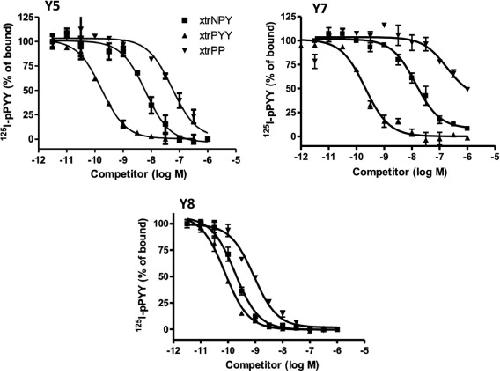 Competition assays performed for Y5, Y7 and Y8 receptors using native NPY, PYY and PP and 125I-pPYY as radioligand. Results shown are from one typical experiment for each receptor (for a summary of all binding experiments see Table 1).