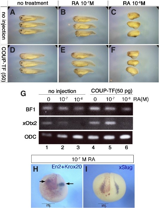 Fig. 2. COUP-TF-B could attenuate the retinoic acid (RA) effects. (A-F) Superficial phenotype of xCOUP-TF-B-injected embryos treated with 10-7 M (B,E) or 10-6 M (C,F) of RA. (G) RT-PCR analysis showing gene expressions of xBF1 (column 1) and Xotx2 (column 2). (H,I) Whole-mount in situ hybridization with xCOUP-TF-B-injected embryos treated with 10-7M RA. Injected side was marked with Red-gal staining by co-injection with lacZ mRNA. Transcription of En2 and Krox20 (H) or xSlug (I) were shown.