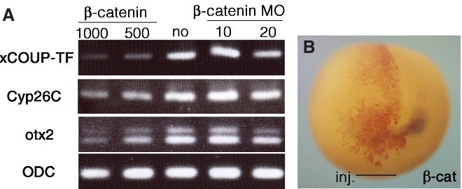 Fig. 3. Brain marker expression in xCOUP-TF-B-inject- ed embryo. (A) RT-PCR analysis with cDNA derived from the anterior half of stage-13 embryo injected with 1000 pg (lane1) or 500 pg (lane 2) of bcatenin mRNA, and 10 ng (lane 4) or 20 ng (lane 5) of bcat MO. (B) Whole-mount in situ hybridization with b-catenin-injected embryo. For tracing the injected area, lacZ mRNA was co-injected and injected embryos were stained with Red-Gal.