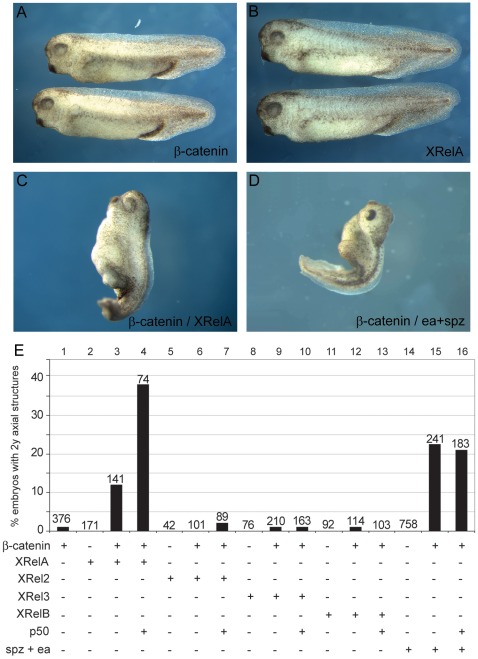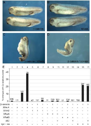 Figure 2. Synergism of XRel and β-Catenin proteins in ectopic axis formation.Suboptimal levels of β-Catenin synergize with XRel proteins or Drosophila Easter/Spätzle to induce axial structures on the ventral side. Embryos injected ventrally with low levels (4 pg) of β-Catenin (A) or 500 pg of XRelA (B), XRel2, XRel3, XrelB RNAs were indistinguishable from uninjected sibling embryos. Co-injection of 500 pg XRelA with 3 pg of β-Catenin could induce rudimentary axial structures (C), as could co-injection of 100 pg each of easter and spätzle with 3 pg of β-Catenin (D). Graphical representation (E) of all injected combinations, indicating a selective synergism between ectopic β-Catenin and exogenous XrelA/p50 heterodimers, as well as with endogenous NF-κB proteins released by ectopic Ea/Spz. |