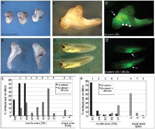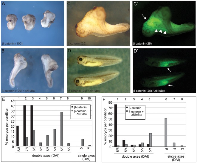 Figure 3. Dorsalisation by ectopic β-Catenin depends on endogenous NF-κB activity.Embryos were injected ventrally with high doses (100 pg, panels A,B) or low doses (25 pg C,D) of β-Catenin RNA, alone (A,C), or with 500 pg ÎNIκBα RNA (B,D). All injections included GFP RNA for lineage tracing (Câ²,Dâ²). A) Embryos injected with high β-Catenin RNA were highly dorsalized (average DAI 6.8 for each axis), almost always lacking posterior structures (nâ=â160). B) Co-injection of 500 pg of ÎNIκBα reduced the secondary axis to an average DAIâ=â3.98, with a small number (8%) being single axis embryos (nâ=â210). C) The majority of embryos injected with low β-Catenin RNA produced pairs of complete axes, both of which scored as â5â on the DAI scale (nâ=â155). D) Coinjecting 500 pg of ÎNIκBα produced mostly single axis embryos (nâ=â162). (Câ²,Dâ²) Lineage tracing showed that the β-Catenin RNA-injected cell progeny accumulated in the anterior region of one of the two axis (white arrow) with some posterior trailing in axial tissue (white arrowheads) (Câ²), while it was localized in posterior ventral tissues when ÎNIκBα was co-injected (Dâ²). Panels E and F summarize the phenotypic penetrance for respectively high (100 pg) and low (25 pg) β-Catenin RNA (3 independent experiments in each case). Numbers on the X-axis indicate DAI-values of each embryonic Anlage (e.g. 5/5 defining a twinned embryo with two complete heads). |