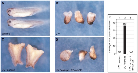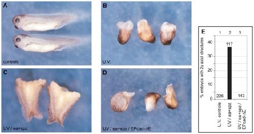 Figure 4. ea/spz-dependent dorsalization requires β-Catenin activity.(A) Untreated controls at tadpole stage (NF 35/36). (B) UV-ventralized siblings (average DAIâ=â0.30). (C) UV-ventralized embryos injected sub-equatorially with 100 pg each of Drosophila easter and spätzle RNA produced embryos with 2 rudimentary trunk axes (37%). (D) Embryos injected with 50 pg EPcadÎE, in addition to easter and spätzle, did not show any axial rescue (0%). (E) Graphical representation of axial rescue, giving total numbers for each experimental cohort. |
