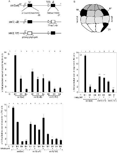 Figure 5. The Xnr3 promoter is regulated through a consensus NF-κB DNA binding site.Panel (A) - Pictorial representation of the Xnr3 promoter and its κB and Tcf binding sites, as well as representations of mutated promoters, which were used in the luciferase reporter gene assays. Bases at mutated nucleotide positions are shown in lower-case letters. (B) Lateral schematic view of a 32-cell stage embryo locating the B1, B4 and D1 blastomeres in black, whose progeny will later contribute to the BCNE, the ventral gastrula center (VGC) and the Nieuwkoop center (NC), respectively. (C) Results of injection of a group of wildtype and mutant Xnr3 promoter driven luciferase constructs, each injected into the B1, B4 and D1 blastomeres of 32-cell stage embryos; y-axis describes x-fold production of luciferase, normalized to an internal renilla control, relative to the luciferase activity of uninjected embryos (lane 1). (D) and (E) Luciferase activities of wildtype and mutant Xnr3 reporter constructs, injected into B1 or B4 blastomeres as indicated, under conditions, in which endogenous NF-κB activity is either antagonized through coninjected XrelAenR (D) or reduced through dominant-negative XMyD88 (E). Luciferase activity was measured at midgastrula (NF11). |