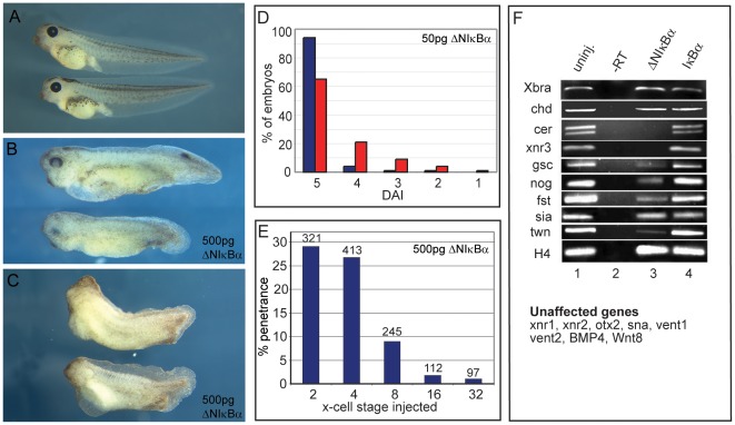 Figure 1. NF-κB activity is required for head formation.A) Wild type embryos at stage 40/41. B, C) Sibling embryos injected sub-equatorially on the dorsal side with 500 pg of ΔNIκBα RNA at the 4-cell stage show pleiomorphic phenotypes: B) Mild phenotypes (DAI 4) are characterized by reduction in forebrain and eyes. C) Stronger phenotypes (DAI 3) show reduced head and dorsal structures. (D) Graphical representation of dorsoanterior index (DAI) of control embryos (blue columns) versus embryos injected dorsally with 50 pg of ΔNIκBα (red columns). (E) Time course analysis of embryos injected dorsally with a total of 500 pg ΔNIκBα RNA at the two, four, eight, 16- and 32-cell stage; the accompanying decrease in cell size was compensated by injecting multiple dorsal cells from the 8-cell stage on (see materials and methods). Y-axis represents the percentage of embryos with anterior truncations. (F) Semi-quantitative RT-PCR analysis for marker genes in stage 10 marginal zone explants. Lane 1: uninjected embryos; lane 2: minus reverse transcriptase control; lane 3: 500 pg ΔNIκBα RNA injected dorsally; lane 4: 500 pg wildtype IκBα RNA injected dorsally. |
