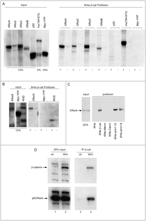 Figure 6. Interaction of β-Catenin and Rel/NF-κB proteins.AâC: in vitro pull down using his-tagged bacterial recombinant β-Catenin and 35S-labelled in vitro translated Rel proteins. (A) XrelA, 2, 3 and B, but not p50, co-precipitated with full length β-Catenin fused to 6His-Trx-S-tag, but not with a control 6His-Trx-S-tag fragment (Tag abbreviated as â6Hisâ in panels). Ax(194â762), an Axin fragment containing the β-Catenin binding domain and Myc-YFP were used as positive and negative controls for the in vitro translated proteins, respectively (nâ¥3 independent experiments). (B) XRelA interacts with β-Catenin via its RHD domain. (C) RelA interaction is mediated by the first eight arm-repeats of β-Catenin: XRelA was found to bind full length β-Catenin and the fragments arm1â12 and arm1â8, but neither the N-terminal nor the C-terminal fragments (B and C: nâ=â2 independent experiments each). (D) Co-Immunoprecipitation of endogenous p65/NF-κB with β-Catenin in Wnt-stimulated REH cells. Extracts from control cells and cells stimulated with Wnt3a-containing medium were immunoprecipitated using an anti-β-Catenin antibody. Immunoprecipitates were analyzed for β-Catenin and p65/NF-κB by Western blots (nâ=â3 independent experiments). |