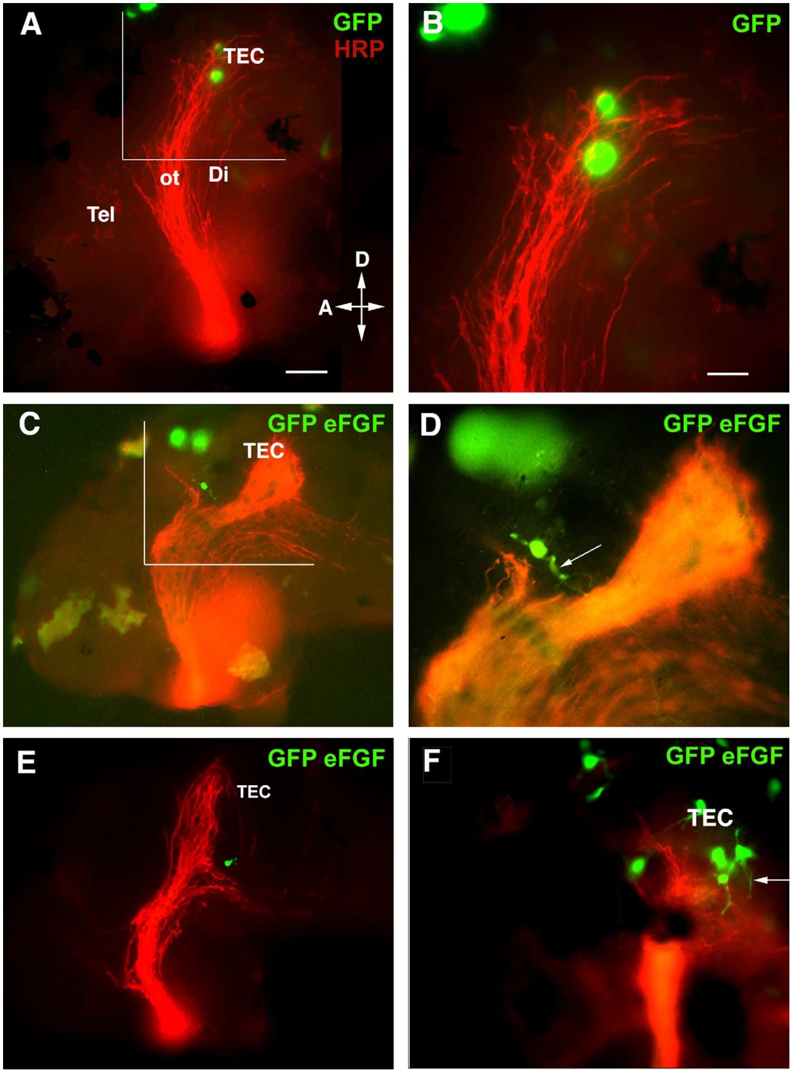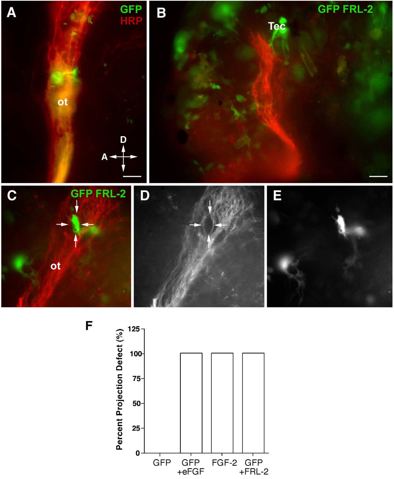 Growth factors have been shown previously to participate in the process of axon target recognition. We showed that fibroblast growth factor receptor (FGFR) signaling is required for Xenopus laevis retinal ganglion cell (RGC) axons to recognize their major midbrain target, the optic tectum [neuron 17 (1996), 245]. Therefore, we have hypothesized that a change in expression of a fibroblast growth factor (FGF) at the entrance of the optic tectum, the border between the diencephalon and mesencephalon, may serve as a signal to RGC axons that they have reached their target. To determine whether RGC axons can sense changes in FGF levels, we asked whether they altered their behavior upon encountering an ectopic source of FGF. We found that in vivo RGC growth cones avoided FGF-misexpressing cells along their path, and that FGF-2 directly repelled RGC growth cones in an in vitro growth cone turning assay. These data support the idea that RGC axons can sense changes in FGF levels, and as such provide a mechanism by which FGFR signaling is involved in RGC axon target recognition.