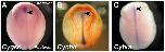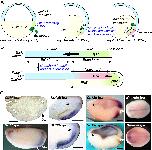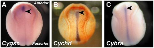 Fig. 6. Gene expression patterns at the neurula stage of Cynops. (A) Cygsc, (B) Cychd and (C) Cybra expression at the neurula stage (stage 18) of Cynops. Cygsc expression is restricted to the fore-notochordal endodermal roof (FNE), just anterior to the notochord. Cychd and Cybra expressions are restricted to the entire notochord. Arrowhead indicates the anterior end of the notochord. (A and C from Kaneda et al., 2009; B is from Motoki et al., unpublished.).
