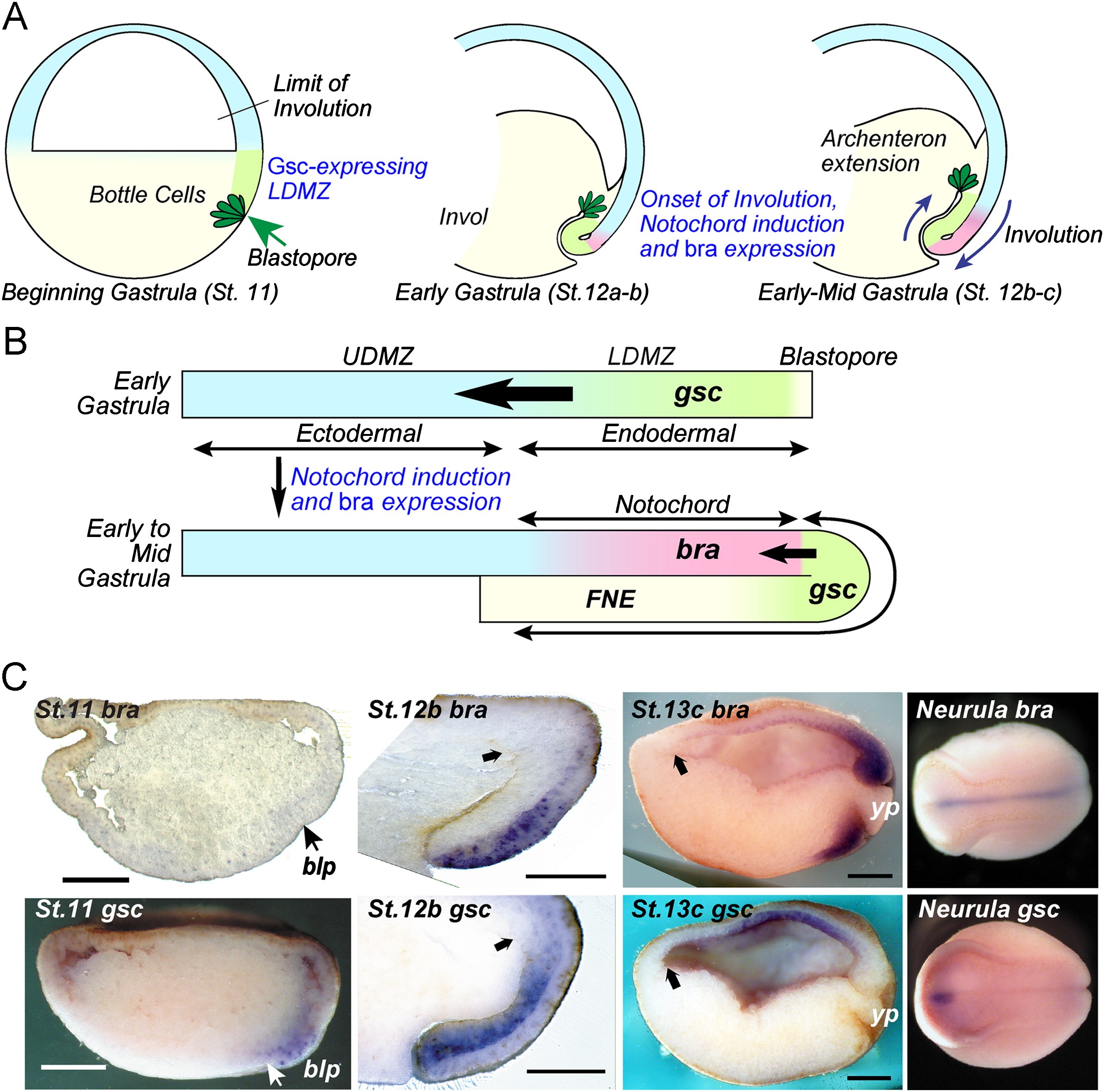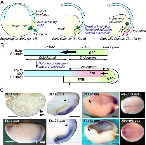 Fig. 9. Planar notochord induction in the upper dorsal marginal zone during the early phase of Cynops gastrulation. (A, B) Spatial and temporal process of anteroposterior regional patterning of the involuting and extending ARF. At the early gastrula stage, the Cygsc-expressing LDMZ is identified as the rechordal regionand the notochord is not yet induced in the UDMZ. During early to mid-gastrulation, the LDMZ planarly induces Cybra-expressing notochord in the UDMZ. As involution proceeds, the LDMZ loses its notochord-inducing activity and forms the fore-notochordal endodermal roof (FNE). Cygsc expression of the LDMZ is progressively restricted to the FNE just anterior to the induced notochord, and finally confined to the prechordal plate. (C) Spatial and temporal expression patterns of Cybra and Cygsc during gastrulation. At stage 11, Cygsc expression is restricted to the surface region of the suprablastoporal endodermal prechordal region (LDMZ); however, Cybra expression is not identified in any part of the embryo. Cybra expression is first induced in the surface presumptive notochord at the mid-gastrula stage (stage 12b). At this stage, Cygsc-expressing cells involute and underlie the surface Cybra-expressing region. Despite the Cygsc expression, the anterior two-thirds of the ARF at this stage show no inducing activity. At the late gastrula stage (stage 13c), Cygsc expression is progressively restricted to the FNE anterior to the induced notochord. At this stage, Cybra is expressed in the posterior one-third of the ARF and the surface region around the blastopore. In neurulae, Cybra expression is restricted to notochord, and the Cygsc-expressing region is confined to the prechordal plate beneath the anterior neural plate. Arrows indicate the anterior margin of the involuting ARF. In B and C, left and right represent the anterior and posterior directions, respectively. blp: blastopore; yp: yolk plug. (B and C reproduced from Kaneda et al., 2009.).