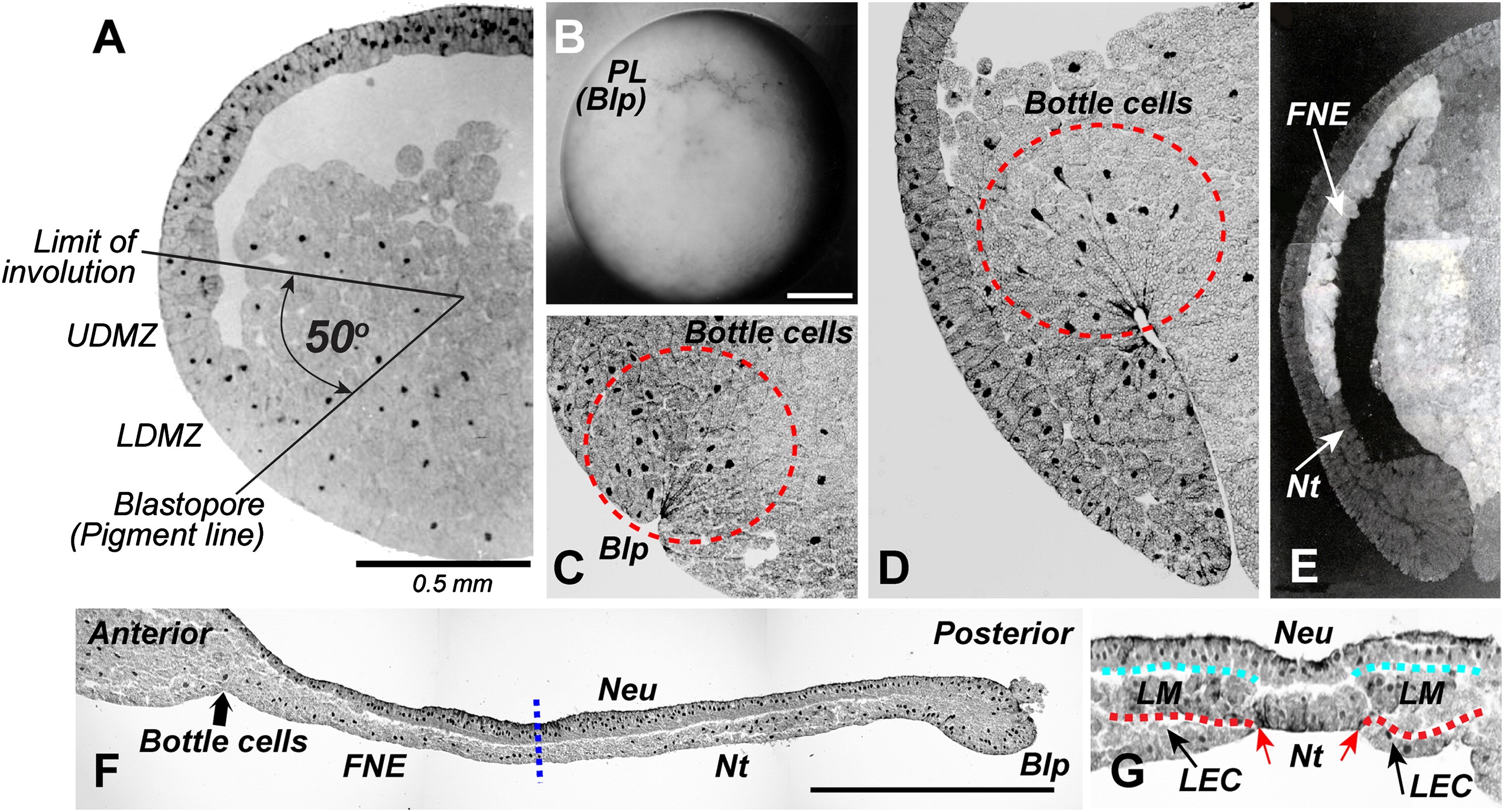 Fig. 3. Fine structure of Cynops early gastrula dorsal marginal zone (DMZ) and the structure of the involuted archenteron roof. (A) At the late blastula/early gastrula stage, the animal cap and DMZ are single-cell-layered structures, except for the most vegetal (future anterior) part of the LDMZ region. The Cynops embryo is approximately 2.2.4 mm in diameter. (Reproduced with permission from Suzuki et al., 1994, Dev. Growth Differ. 39, 13541); (B) External form of a stage 11 beginning gastrula. The crescent-shaped pigment line (PL) is formed by the accumulation of bottle cells at the dorso-vegetally restricted blastopore (Blp) site. (C) Fine structure of the blastopore (Blp) with bottle cells (red dotted circle) at stage 11. (D) Involution of the DMZ about 6 h after the onset of gastrulation (approximately stage 12a). Bottle cells are seen in the red dotted circle. (Figs. C and D reproduced with permission from Sakaguchi et al., 2002, Int. J. Dev. Biol., 79300); (E) Spemann and Mangold (1924) inserted the DLP into the blastocoel of the host embryo and analyzed the organizing activity of the DLP. Imoh et al. (1998) transplanted the LDMZ into the surface layer of the host embryo. The LDMZ is isolated with bottle cells and part of the sub-blastoporal endoderm from a FDA-labeled embryo, transplanted into the surface layer of the ventral part of a stage 11 gastrula and then the FDADMZ transplanted embryo develops to the late gastrula stage. Transplanted LDMZ induces a complete secondary archenteron roof (ARF) in which the notochord of the secondary axis is entirely derived from host cells, while the transplanted LDMZ forms the fore-notochordal endodermal roof (FNE) of the secondary ARF. (Reproduced with permission from Imoh et al., 1998, Dev. Growth Differ. 40, 43948). (F) Single-cell-layered structure of the late gastrula ARF. It is divided into notochord (Nt) and FNE. Dotted line is the approximate position of the boundary between the notochord and FNE. Neu, neuroectoderm. (G) Cross-section of the early neurula ARF. Notochordal plate (Nt) occupies the median line of the ARF. Lateralmesoderm (LM) is covered with lateral endodermal crest (LEC). During neurulation, LEC progressively covers the Nt, and the ARF is finally covered with endoderm at the mid- to late neurula stage. Blue dotted line represents the boundary between neuroectoderm and LM. Red dotted line represents the boundary between LM and LEC. (For interpretation of the references to color in this figure legend, the reader is referred to the web version of this article.)
