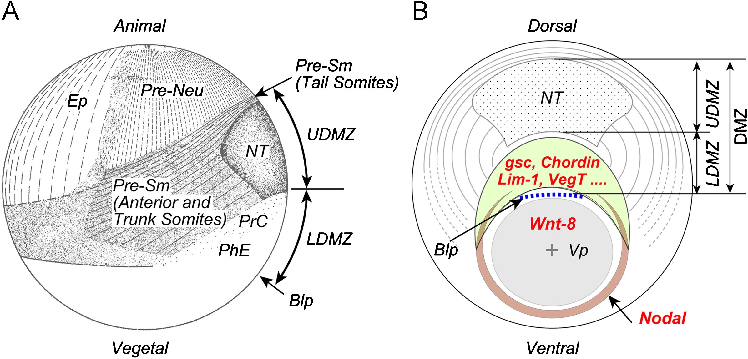 Fig. 4. Fate map and gene expression domains of Cynops early gastrula. (A) Fate map of Cynops late blastula/early gastrulaembryo (right-lateral view, redrawn from Nakamura, 1942). Like other urodeles ( [Vogt, 1929] and [Pasteels, 1942]), Cynops has a large surface prospective mesoderm. Presumptive pharyngeal endoderm (PhE), prechordal plate (PrC), notochord (NT) and tailsomites (Pre-Sm) are planarly located on the embryo's surface. Presumptive anterior and trunksomites (Pre-Sm) are located lateral to the presumptive notochord. (B) Gene expression map of early Cynops gastrula (dorso-vegetal view). At the early gastrula stage, expressions of Cygsc, Cychd, Cylim-1, Cynog and CyVegT are preferentially restricted to the LDMZ (light green), and their expressions do not extend below the blastopore. CyNodal (Ito et al., 2006) is expressed around the marginal zone, except for the LDMZ region. Cynops Wnt-8 is expressed in the ventro-vegetal part of the embryo (gray) around the vegetal pole (Vp), but Wnt-8 expression does not extend beyond the blastopore (Blp). Cybra is not expressed in any part of the embryo at this stage. The presumptive notochord (UDMZ) has epidermal self-differentiation capacity at this stage and no inducing activity. (Gene expression patterns are from Motoki et al., unpublished). (For interpretation of the references to color in this figure legend, the reader is referred to the web version of this article.)