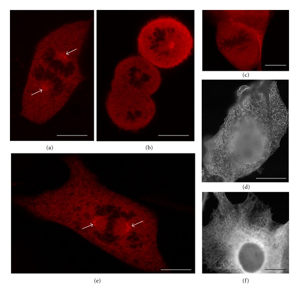 Figure 2. Expression of Myc-XlTCTP in Xenopus laevis XL2 cells. (a) Confocal section of XL2 cell in anaphase with high concentration of XlTCTP at the spindle poles (white arrows). (b) Confocal section of two dividing XL2 cells with high concentration of XlTCTP at the spindle poles. (c) Control mitotic XL2 cells expressing Myc tag only. (d) Interphase XL2 cell expressing Myc-XlTCTP. XLTCTP is localized in distinct fibers in the cytoplasm. (e) Mitotic murine NIHT3T cell expressing Myc-XlTCTP. High concentration of XlTCTP is present at the spindle poles (white arrows). (f) Interphase murine NIH3T3 cells expressing Myc-XlTCTP. Note that XlTCTP forms MT-like fibers in the cytoplasm. Bar is equal to 20 μm.
