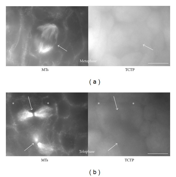 Figure 5. MTs and TCTP in mitotic Xenopus laevis oogonia. Left: β-tubulin, right: TCTP localization in tadpole oogonia. Anti-XlTCTP was used for this localization. Upper panel: metaphase cell. Left: mitotic spindle visualized by β-tubulin staining (white arrow). Right: The whole of the spindle is positive for TCTP (white arrow). Bottom panel: two telophase oogonia. Left: prominent midbides are visualized by anti-β-tubulin immunoflorescence (white arrows). White asterisks show the position of two daughter cells. Note the absence of TCTP in the midbodies. Bar is equal to 20âμm.