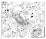 Figure 6. Double labeling of γ-tubulin and TCTP in the centrosome of Xenopus laevis oogonium. Centriole labeled with black asterisk; 18 nm gold particles (black arrows) correspond to the presence of TCTP, small, and 10 nm gold particles around the centriole mark the presence of γ-tubulin. Inset in the bottom right corner shows the central area around the centriole where γ-tubulin is present (clear central area), and the TCTP-containing external area of the centrosome (dark grey). Bar is equal to 100 nm.