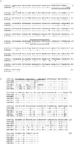 Figure 1. There are two X. laevis TIMP2 genes that are highly homologous to the TIMP2 gene in other vertebrates.A) Nucleotide sequence comparison of X. laevis TIMP2A and TIMP2B. Dot (.): identical sequence; dash (-):a gap introduced for better alignment. Arrowed lines indicate the locations of the primers used to distinguish the two isoforms in RT-PCR analysis. B) Comparison of the protein sequences of putative X. laevis TIMP2A (XlTIMP2A, AAH74452), X. laevis TIMP2B (XlTIMP2B, NP_001087748), and X. tropicalis TIMP2 (XtTIMP2, NP_001015760) with their ortholog from chick (ChTIMP2, NP_989629), mouse (mTIMP2, P25785) and human (HuTIMP2, NP_003246). The conserved cysteine sequences are in bold and the signal peptide sequence is underlined. Dot (.): identical sequence; dash (-): a gap introduced for better alignment.