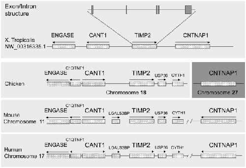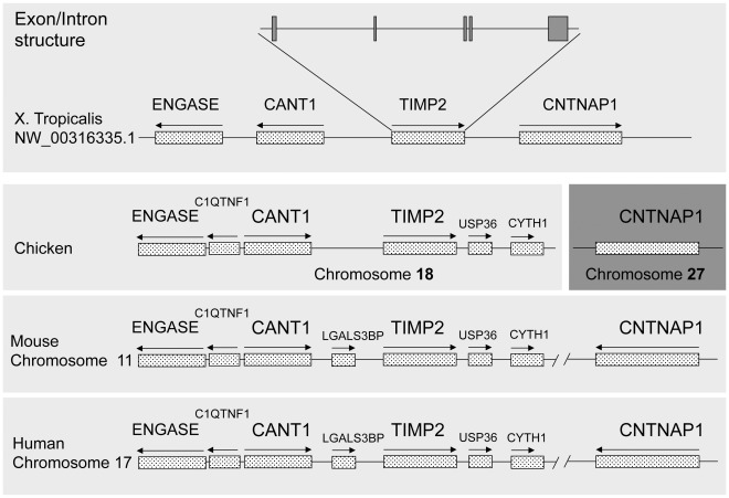 Figure 2. Comparison of the genomic locus and organization of X. tropicalis and human TIMP2.X. tropicalis, chicken, mouse and human TIMP2 genomic organizations were obtained from NCBI database. The lines represent the genomic sequences and the boxes with arrowed lines on top represent transcribed regions and the direction of the transcription. The lines and boxes were not drawn to the same scale for better visualization. The TIMP2 gene in all four species has the same intron/exon organization with 5 exons total as shown for X. tropicalis TIMP2 (not shown). Note that mouse and human TIMP2 loci are identical. In the chicken, CNTNAP1 gene is present on a different chromosome (shown in a darker shade).