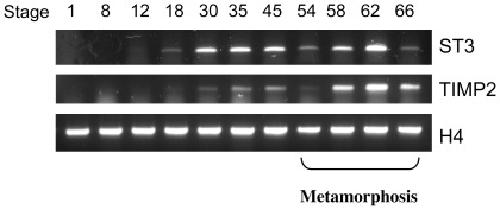 Figure 3. TIMP2 expression during X. laevis development.Total RNA was isolated from whole animals during X. laevis development and subjected to One-Step RT-PCR analysis with a pair of primers amplifying both TIMP2A and TIMP2B (TIMP2) or stromelysin-3 (ST3). The expression of the house-keeping gene histone H4 was similarly determined as a control.