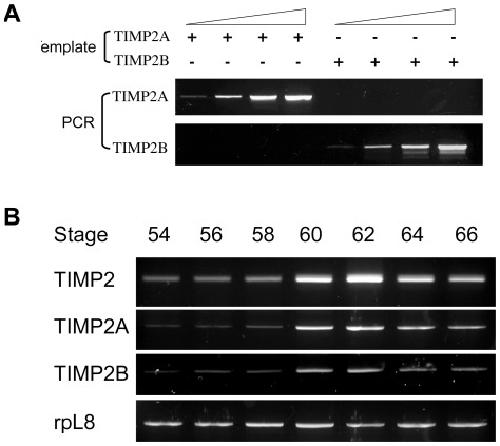 Figure 4. Co-regulation of TIMP2A and TIMP2B expression during intestinal metamorphosis.A) Validation of primer specificity for X. laevis TIMP2A or TIMP2B. The TIMP2A and TIMP2B cDNA were cloned into pCR2.1 vector, sequenced and serially diluted to serve as template DNA for PCR. Note that each primer pair specifically amplified only the intended TIMP2 gene. B) Total RNA was isolated from intestines of tadpoles during X. laevis metamorphosis and subjected to One-Step RT-PCR with a pair of primers recognizing both TIMP2 genes (TIMP2), specific for either TIMP2A or TIMP2B, respectively. The expression of the house-keeping gene rpL8 was similarly determined as a control.