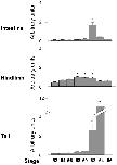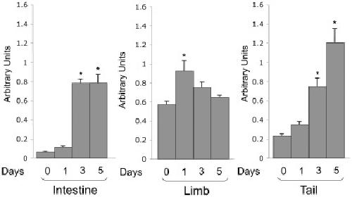 Figure 6. T3-inducktion of TIMP2 expression in different tissues of premetamorphic tadpoles.Tadpoles at premetamorphic stage 54 were treated with 10 nM T3 at 18°C and collected every other day for isolating total RNA from different tissues. The RNA was analyzed by qRT-PCR analysis as in Fig. 5. *: p<0.05 when compared to the group without T3 treatment.
