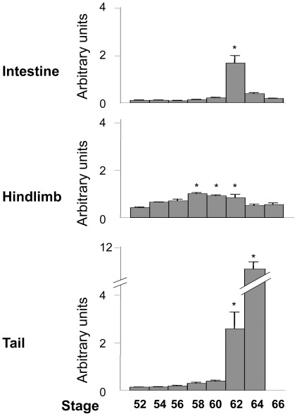 Figure 5. Tissue-specific regulation of TIMP2 expression correlates with metamorphosis.Total RNA was isolated from intestines, hindlimbs and tails of metamorphosing tadpoles at the indicated stages and subjected to qRT-PCR analyses with a primer/probe set specific for TIMP2 or rpL8 (RNA loading control), respectively, and the TIMP2 expression level was normalized to that of rpL8 expression level and plotted in arbitrary units. *: p<0.05 when compared to stage 52.
