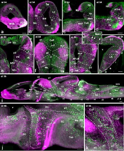 Supporting Figure 3 (Magentahyphen;green version of Figure 4 for the assistance of colorhyphen;blind readers): Photomicrographs of doublehyphen;labeled CB/CR transverse (ahyphen;h) and sagittal (ihyphen;k; dorsal is upwards and rostral to the left) sections through representative levels of the brain of Xenopus at prometamorphic stages (indicated on each photomicrograph). The levels of transverse sections are indicated in Figure 1d. In all photographs green is CB and red is CR, whereas yellow represents double labeled cells. Dashed lines represent the approximate boundary between telencephalic (ahyphen;d, i), diencephalic (ehyphen;g, ihyphen;k), mesencephalic (g,h) and rhombencephalic (i) subdivisions. i: Low magnification image of a lateral sagittal section showing the relationship between CB and CR labeled structures throughout the brain of a prometamorphic larva. j,k: Details of sagittal sections through the hypothalamic (j) and pretectal (k) region showing the relative localization of CBhyphen; and CRhyphen;labeled structures in each subdivision.. Inset in panel g' shows trigeminal mesencephalic neurons (arrowheads) in the rostral optic tectum. For abbreviations, see list. A magentahyphen;green version of this figure is provided as Supporting Information Figure 3. Scale bar =100 μm in ahyphen;h,k; 200 μm in i,j. |