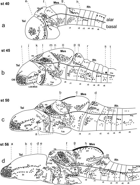 Figure 1. Schematic representation of the general distribution of calbindin (empty dots) and calretinin (filled dots) immunoreactive cells in a sagittal views of the brain at representative early embryonic (a) late embryonic (b) premetamorphic (c) and prometamorphic (d) stages. In all schemes dorsal is oriented upward and rostral to the left. The main subdivisions with regard to the neuromeric models are indicated. In each scheme the dashed lines represent the levels of the sections shown in the microphotographs in subsequent figures. Levels indicated in a and b correspond to photographs in Figure 2, levels indicated in c correspond to photographs in Figure 3, and levels indicated in d correspond to photographs in Figure 4. For abbreviations, see list. |