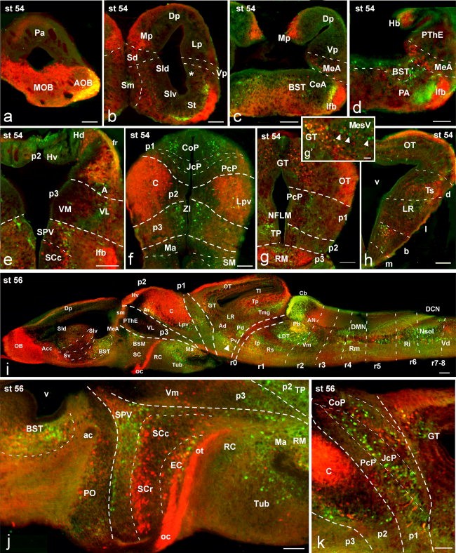 Figure 4. Photomicrographs of double-labeled CB/CR transverse (a) and sagittal (i; dorsal is upwards and rostral to the left) sections through representative levels of the brain of Xenopus at prometamorphic stages (indicated on each photomicrograph). The levels of transverse sections are indicated in Figure 1d. In all photographs green is CB and red is CR, whereas yellow represents double-labeled cells. Dashed lines represent the approximate boundary between telencephalic (a,i), diencephalic (e,i), mesencephalic (g,h), and rhombencephalic (i) subdivisions. i: Low magnification image of a lateral sagittal section showing the relationship between CB and CR labeled structures throughout the brain of a prometamorphic larva. j,k: Details of sagittal sections through the hypothalamic (j) and pretectal (k) region showing the relative localization of CB- and CR-labeled structures in each subdivision. Inset in g′ shows trigeminal mesencephalic neurons (arrowheads) in the rostral optic tectum. For abbreviations, see list. A magenta-green version of this figure is provided as Supporting Information Figure 3. Scale bars = 100 μm in a,k; 200 μm in i,j. |