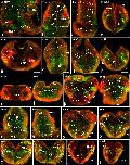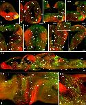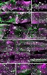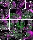 Supporting Figure 1 (Magentahyphen;green version of Figure 2 for the assistance of colorhyphen;blind readers): Photomicrographs of doublehyphen;labeled CB/CR sagittal (a, dorsal is upwards and rostral to the left) and transverse (bhyphen;t) sections through representative levels of the brain of Xenopus at embryonic stages (indicated on each photomicrograph).The levels of transverse sections are indicated in Figure 1a and b. In all photographs green is CB and red is CR, whereas yellow represents double labeled cells. Dashed lines mark the approximate boundary between neuromeres and telencephalic subdivisions. Arrowheads in f point to the lateral CRir fiber tract in p2, in h and s point to the lateral CRir fiber tract in the basal plate, and in q to doble labeled cells in the LDT. The asterisks in r and t mark the CBir fibers in the lateral rhombencephalon. For abbreviations, see list. A magentahyphen;green version of this figure is provided as Supporting Information Figure 1. Scale bar = 50 μm in ahyphen;h; 100 μm in ihyphen;t. |
