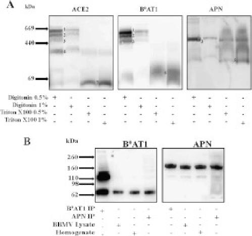 Figure 1. Isolation of intestinal brush-border protein complexesMurine intestinal BBMVs were prepared using MgCl2 precipitation and centrifugation. (A) BBMVs (50 μg/sample) at 1 mg/ml were solubilized in detergent buffer as indicated and mixed with Coomassie Brilliant Blue G-250 loading dye before separation. Samples were separated by Blue native PAGE. Following semi-dry transfer on to a PVDF membrane, individual proteins were detected by immunoblot analysis. The blot was stripped and re-probed for the proteins indicated, to allow a direct comparison of band positions. Protein complexes and individual proteins are numbered 1–7 (discussed in the main text). (B) Murine BBMVs were solubilized in co-immunoprecipitation buffer, followed by incubation with Protein A and primary antibodies against either B0AT1 or APN. After overnight incubation of BBMV samples, the cleared lysate and intestinal homogenate were separated by SDS/PAGE. Following semi-dry transfer on to a nitrocellulose membrane, the blots were pre-stripped using stripping buffer and blocked overnight to reduce background signal. Individual proteins were then detected as indicated above the blot and visualized using immunoblot analysis. Molecular masses are indicated to the left-hand side in kDa.