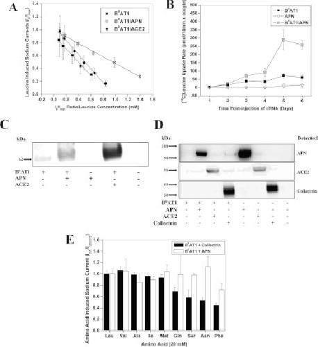 Figure 4. Changes in B0AT1 transporter kinetics by APN and ACE2Oocytes were injected with combinations of the following amounts of cRNA: B0AT1, 10 ng; APN, 15 ng; ACE2, 10 ng; and collectrin, 2 ng. Leucine-induced Na+ currents were recorded on day 5 post-injection, except those co-injected with B0AT1 and ACE2, which were recorded on day 3 or 4 post-injection. (A) Oocytes were voltage-clamped at −50 mV and subsequently superfused with serial concentrations of leucine (0.1–10 mM) in descending and then ascending order. B0AT1-expressing oocytes were not superfused with 0.1 mM leucine due to a low signal to noise ratio elicited at this concentration. An Eadie–Hofstee linear regression plot of the data points is shown. Each data point represents the mean±S.D. (n=6–8, e=3). (B) Uptake of 100 μM [14C]leucine was measured over 15 min on days 1–6 post-injection. Oocyte endogenous [14C]leucine uptake has been subtracted. Each data point represents the mean±S.D. (n=8–12, e=3). (C) A total of 15 oocytes per sample were incubated in 0.5 mg/ml sulfo-NHS-LC-biotin on day 5 post-injection before being lysed and treated with streptavadin-coated agarose beads. Samples were separated by SDS/PAGE, blotted, detected and visualized for B0AT1 using immunoblot analysis. (D) A total of 15 oocytes per sample were prepared as in (C). Following SDS/PAGE, proteins were detected and visualized using immunoblot analysis for APN. Membranes were prepared for detection of subsequent proteins by stripping, re-blocking and re-probing of the protein indicated. Molecular masses are indicated to the left-hand side in kDa. (E) Oocytes were voltage-clamped at −50 mV and subsequently superfused with 20 mM of the amino acid (AA) indicated. All substrate-induced currents were normalized to a 20 mM leucine current (ILeu) to account for transporter de-sensitization. Each bar represents the mean±S.D. (n=6–8, e=3).