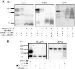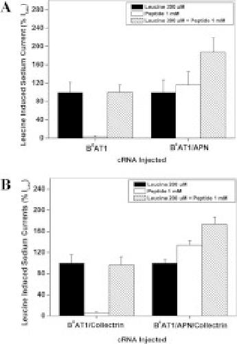 Figure 5. Mechanism of APN-mediated increase in substrate affinity of B0AT1Oocytes were injected with 10 ng of B0AT1 cRNA, 15 ng of APN cRNA and 2 ng of collectrin cRNA. (A) Oocytes were voltage clamped at −50 mV and subsequently superfused with either 200 μM leucine or 1 mM Leu-Ser-Lys-Leu tetrapeptide. Leucine-induced sodium currents were recorded 4–6 days post-injection. All Na+ currents were normalized to the sodium currents elicited by 200 μM leucine (ILeu) at 100%. Each bar represents the mean±S.D. (n=6–8, e=3). (B) Oocytes were recorded as indicated in (A) and superfused with either 200 μM leucine or 1 mM leucine tripeptide. All Na+ currents were normalized to the Na+ currents elicited by 200 μM leucine (ILeu) at 100%. Each bar represents the mean±S.D. (n=18).