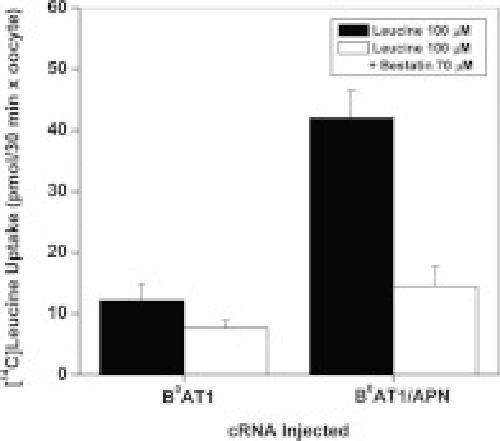 Figure 6. Mechanism of APN-mediated increase in substrate affinity of B0AT1Oocytes were injected with either 10 ng of B0AT1 cRNA or 15 ng of APN cRNA. Uptake of [14C]leucine was measured over 30 min on day 5 post-injection. Bestatin (70 μM) was pre-incubated for 1 min before leucine was added. Oocyte endogenous leucine transport has been subtracted in all experimental conditions. Uptake was normalized to that measured in oocytes expressing B0AT1 alone in the presence of 100 μM leucine. Each bar represents the mean±S.E.M. of data combined from four experiments (n=33–38).