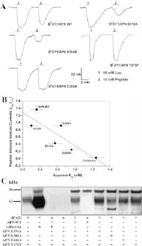 Figure 9. Mechanism of APN-mediated increase in substrate affinity of B0AT1Oocytes were injected with either 10 ng of B0AT1 cRNA, 15 ng of APN cRNA or 2 ng of collectrin cRNA. (A) Oocytes were voltage clamped at −50 mV and subsequently superfused with either 10 mM leucine or 10 mM Leu-Ser-Lys-Leu tetrapeptide. Each tracing is a typical example of currents observed in all oocytes injected with the cRNA indicated. Leucine-induced sodium currents were recorded on day 4 and 5 post-injection for all oocytes. (B) Oocytes were recorded as indicated in (A). Each data point indicates an APN mutant co-expressed with B0AT1, or B0AT1 co-expressed with collectrin. All peptide-induced sodium currents were normalized to the corresponding leucine-induced Na+ current (IPep/ILeu). Each data point represents the mean±S.D. for both peptide-induced sodium currents and apparent Km values. The trend line was fitted using linear regression (r=−0.84, P=0.035 and n=74). (C) A total of 15 oocytes/sample were incubated in 0.5 mg/ml sulfo-NHS-LC-biotin on day 5 post-injection before being lysed and treated with streptavadin-coated agarose beads. Samples were separated by SDS/PAGE. Subsequently B0AT1 was detected by immunoblotting. Molecular masses are indicated to the left-hand side in kDa.