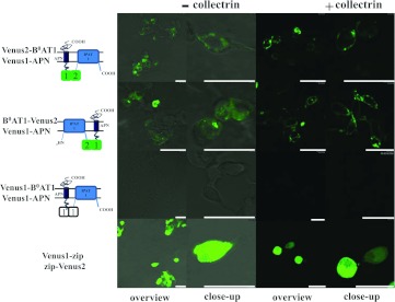 Figure 2. Co-localization of B0AT1 and APNHEK-293 cells in eight-well microscope slide dishes were transfected with plasmid DNA (constructs used are indicated on the left-hand side) when cells had achieved >90% confluency. The eGFP fluorescence was visualized with a Leica SP5 confocal system and processed with LAS AF software. Indicated above the panels is whether or not cells were co-transfected with the pcDNA mammalian expression vector encoding the trafficking protein collectrin. The white scale bars indicate 25 μm. All images were taken at ×63 magnification.