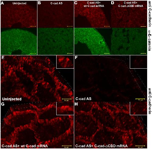 ) Immunostaining for C-cadherin (upper panels) and αEC (lower panels) in paraffin sections of stage 9 embryos, showing the non-rescue of cell adhesion in the absence of the CBD. (E) 3D projections of high magnification, and high resolution confocal images showing the localization of C-cadherin protein. Scale bars for A-D, 50 , E-H, 20 . |