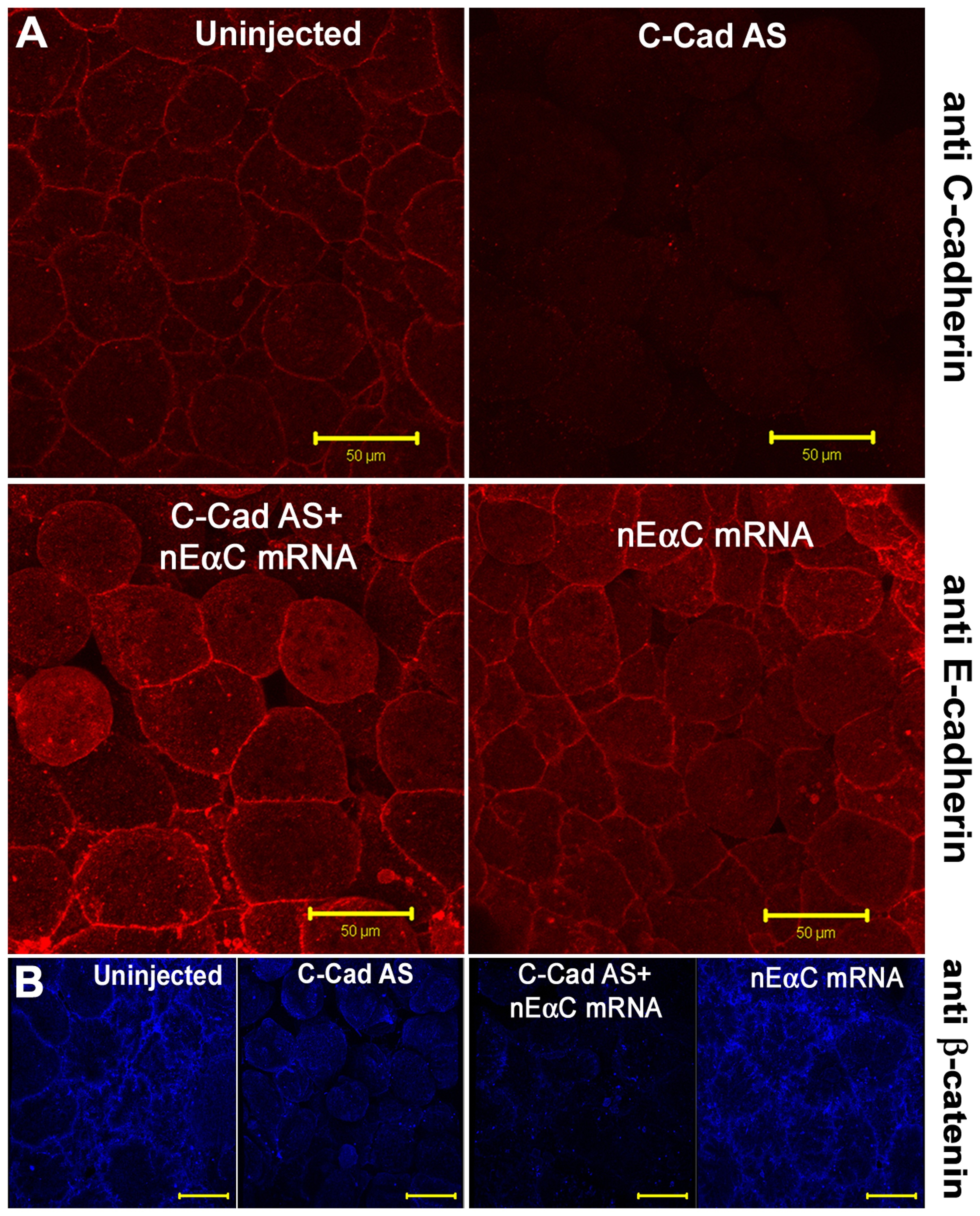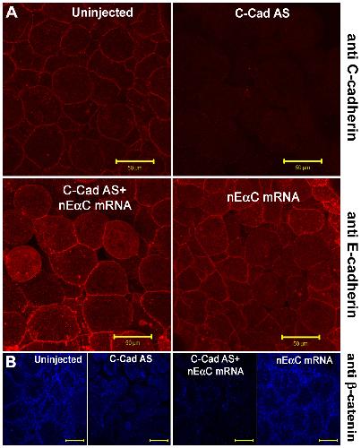 (A) Immunostaining for C-cadherin (upper panels) and E-cadherin extracellular domain (lower panels) in animal caps, showing the rescue of cell adhesion and the expression of nEαC in cell junctions. (B) Immunostaining for β-catenin showing the junctional localization of nEαC is not through β-catenin. Scale bars for A-B, 50 . |