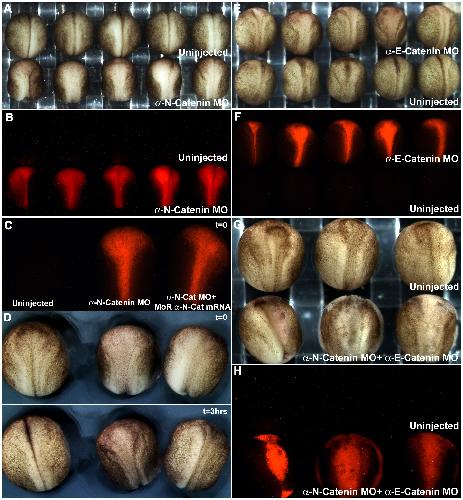 (A) Robust open neural plate phenotype observed in αNC morpholino-injected embryos. (B) RLDX fluorescent signal marking the descendents of αNC morpholino-injected cells of embryos shown in (A). (C) RLDX fluorescent signal marking the descendents of αNC morpholino and rescued mRNA-injected cells, for embryos shown in (D, first frame). (D) First and last frames of a timelapse movie taken at 5 minute intervals, showing the rescue of neurulation movements by sequentially injecting αNC mRNA into morpholino-injected cells. (E) Delay in neurulation movements observed in αEC-depleted neural plates. (F) RLDX fluorescent signal marking the descendents of αEC morpholino-injected cells of embryos shown in (E). (G) Embryos depleted of both αEC and αNC, showing cell dissociation in their neural plates. (H) RLDX fluorescent signal marking the descendents of αEC and αNC morpholino-injected cells for embryos shown in (G). |