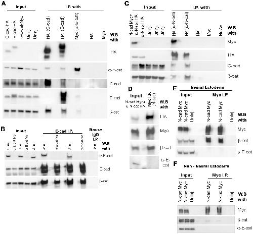 (A) Western blot data of immunoprecipitations of the C-, and E-, cadherin complexes, using HA-tagged C-, and E-, cadherin, and Myc-tagged α-E-catenin, expressed in the non-neural ectoderm. (B) Western blot data of duplicate E-cadherin immunoprecipitations on wild type or αEC-depleted embryos. (C) Western blot data of immunoprecipitating N-cadherin-Myc or αNC-HA expressed in the neural ectoderm. (D) Sequential immunoprecipitation of N-cadherin-Myc from the lystae of N-cadherin-Myc + αNC-HA mRNA-injected embryos from (C). (E) Replicate immunoprecipitations of N-cadherin-Myc in embryos expressing N-cadherin-Myc in their neural ectoderms. (F) Replicate immunoprecipitations of N-cadherin-Myc in embryos expressing N-cadherin-Myc in their non neural ectoderms. |
