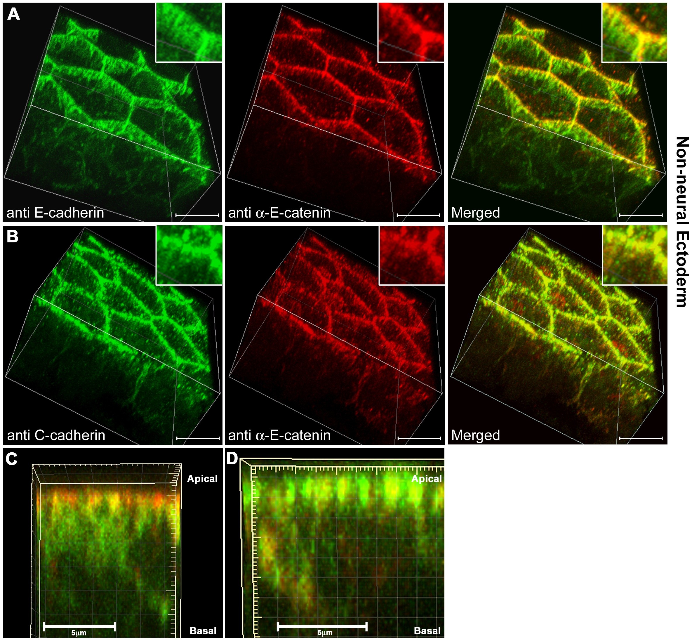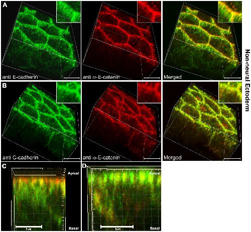 (A) E-cadherin (green) and αEC (red) staining in wholemount, cleared, non-neural ectoderm samples imaged at 100in nyquist limit and using a 2zoom. (B) C-cadherin (green) and αEC (red) staining.(C) Side view projection of a 3D image stack from a single cell-cell contact membrane, E-cadherin (green) and αEC (red). (D) Side view projection of a 3D image stack from a single cell-cell contact membrane, C-cadherin (green) and αEC (red). Scale bars in A-B, 15 , C-D, 5 . |