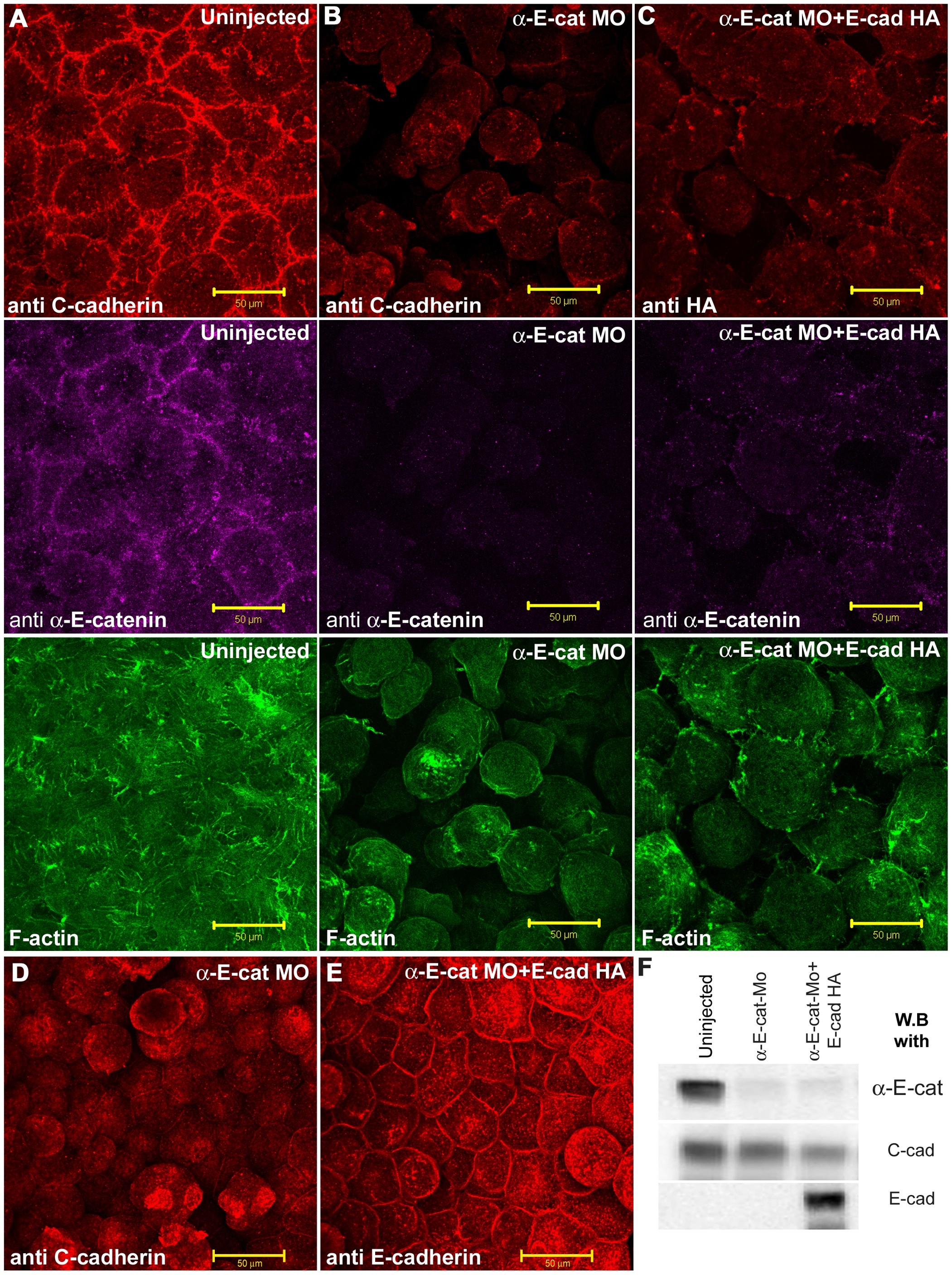 (A-C) Blastocelic roof cells of st. 9 animal caps stained for C-cadherin (red in A and B), or E-cadherin-HA (red in C), αEC (purple), and F-actin (green) in uninjected (A), αEC-depleted (B), or αEC + E-cadherin-HA mRNA injected (C) embryos. (D-E) Superficial cells imaged from the blastocelic cavity in animal caps where all the deeper cells have fallen off, stained for C-cadherin in (D), or E-cadherin (E), in αEC depleted (D), or αEC depleted + E-cadherin-HA mRNA-injected (E) embryos. (F) Western blot data showing the depletion of αEC protein and the expression of C-, and E-, cadherin protein levels in the experiment. Scale bars, 50 . |