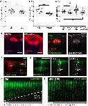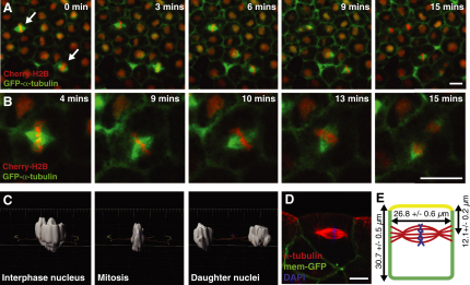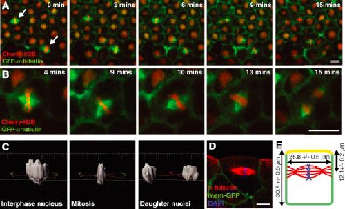 Figure 1. Mitotic Spindle Position in a Developing Epithelium(A) Stills taken from a single focal plane movie of mitotic spindles in the outer epithelial layer of a Xenopus laevis embryo. Embryos were injected with GFP-α-tubulin (green) to label spindles and Cherry-histone2B (Cherry-H2B) to highlight chromosomes. Spindles are aligned parallel to the plane of the epithelium but are also held in a specific position along the apicobasal axis of the cell; spindles in neighboring cells assemble in the same focal plane and remain here throughout mitosis (arrows).(B) Zoom-in of movie in (A) shows that spindles undergo rapid rotational movement in the x/y plane, while remaining held in parallel orientation and apicobasal position.(C) 3D reconstruction of Cherry-H2B fluorescence from a z stack confocal movie (Movie S2), which can be used to track the apicobasal position of nuclei as mitosis proceeds (side view; apical at top, basal at bottom). Virtually no movements in the apicobasal axis are seen.(D) A side-view image of a mitotic spindle in the outer epithelium of a fixed embryo (apical at top, basal at bottom) demonstrates the apicobasal position of spindles in these cells.(E) Mean values for cell length, width, and distance of spindle from apical surface are shown (±SEM, n = 91 spindles in 18 embryos).Scale bars represent 20 μm in (A) and (B) and 10 μm in (D). See also Movies S1 and S2. |