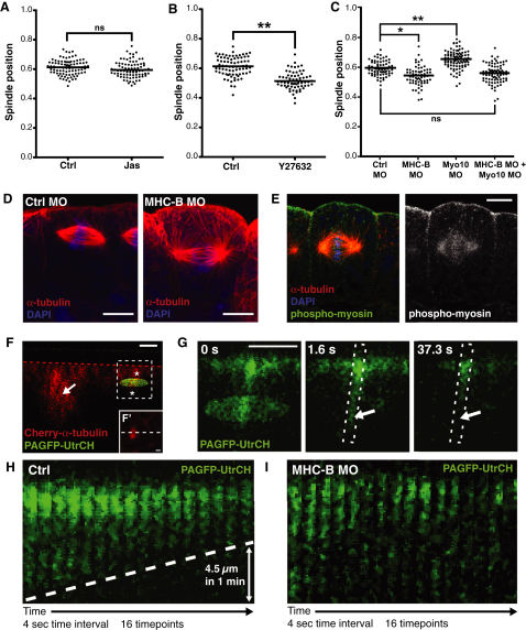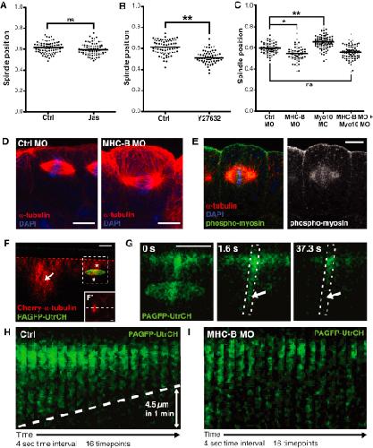 Figure 6. Myosin-2 Functions with F-Actin to Position the Spindle(A) Quantification of spindle position in control (Ctrl) and Jas-treated embryos indicates no effect on spindle position when F-actin turnover is disrupted. ns, not significant.(B) Inhibition of myosin-2 by the Rho kinase inhibitor, Y27632, causes spindles to position closer to the basal surface, compared to controls (∗∗p < 0.01).(C) Knockdown of myosin-2 function using a morpholino against myosin heavy-chain B (MHC-B MO) also causes spindles to position more basally compared to controls (Ctrl MO). Double knockdown of myosin-2 and Myo10 rescues the effects seen in single knockdowns, and spindles are positioned as in controls. To test for significance, unpaired Student's t tests were performed (in B, n = 4 independent experiments, from a total of 20 and 30 embryos for Ctrl and Y27632, respectively; in C, n = 3 independent experiments, from a total of 21 embryos for Ctrl MO, MHC-MO, and Myo10 MO, and 20 embryos for MHC-B MO + Myo10 MO; ∗p < 0.05, ∗∗p < 0.01). ns, not significant.(D) Confocal images of spindles in Ctrl MO and MHC-B MO embryos; note the basal position of the MHC-B MO spindle.(E) Staining for active myosin-2 (phospho-myosin; green) shows a strong accumulation apically, trailing off on the lateral sides in a basal direction.(F) To test for an apically directed cortical flow of actin filaments, photoactivatable-GFP fused to the GFP-UtrCH probe (PAGFP-UtrCH) was used (green). Cherry-α-tubulin (red) was coexpressed to identify mitotic cells, which were imaged in z (F′ shows an x/y image of the cell in F; white dashed line indicates the line of cross-section for F), and a zone of photoactivation (green oval) was positioned across the cell cortex (asterisks) approximately 5 μm down from apical cell surface (indicated by red dashed line).(G) A zoom-in of the region indicated by dashed box in (F); photoactivation causes an accumulation of fluorescence apical of the zone of photoactivation. To assess any movement of F-actin, we followed the loss of fluorescence that occurs once photoactivation is stopped. We saw progressive loss from basal to apical (arrows) over time, suggesting an apical-ward movement of F-actin.(H) Kymographs (of boxed region in G) show the progressive loss of fluorescence from basal to apical, the gradient of which (dashed line) can be used to estimate the speed of F-actin movement. In this case, the fluorescence front receded apically by 4.5 μm in 1 min.(I) Knockdown of myosin-2 function (MHC-B MO) stops the directional loss of fluorescence, indicating stalled F-actin movement. Four control embryos and three MHC-MO injected embryos were analyzed, with similar results.Scale bars represent 10 μm in (D) and (E) and 5μm in (F), (F′), and (G); time stamps indicate time in seconds. See also Figure S4 and Movies S5 and S6. |