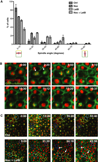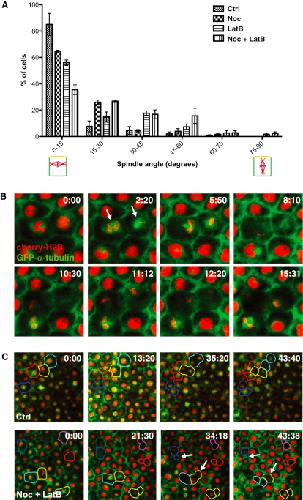 Figure 7. Microtubules and F-Actin Show Partial Redundancy in Spindle Orientation(A) Quantification of spindle angle in Ctrl, Noc, LatB, and Noc + LatB-treated embryos. Spindle angle was measured relative to the x/y plane, such that a spindle angle of 0° denotes a spindle that is oriented parallel to the epithelium and will undergo a symmetric division, and 90° denotes a spindle that is oriented perpendicular and will undergo an asymmetric division. Treatment with either Noc or LatB alone causes a slight reduction in parallel spindles, but a much larger reduction is seen in double-treated, Noc + LatB, embryos. Error bars represent SEM (n = 3 independent experiments, from a total of 17, 16, 19, and 20 embryos for Ctrl, Noc, LatB, and Noc + LatB, respectively).(B) Stills from Movie S7, following two spindles (arrows) in a Noc + LatB-treated embryo. Both spindles undergo random rotations out of the plane of the epithelium.(C) Cell perimeters in Ctrl and Noc + LatB embryos traced through one cell division. Each Ctrl division results in two daughter cells of similar apical surface area; divisions in Noc + LatB produce daughter cells of differing apical cell surface. In some cases (arrows) cells with a smaller apical surface are lost from the epithelial layer.See also Figure S5 and Movie S7. |
