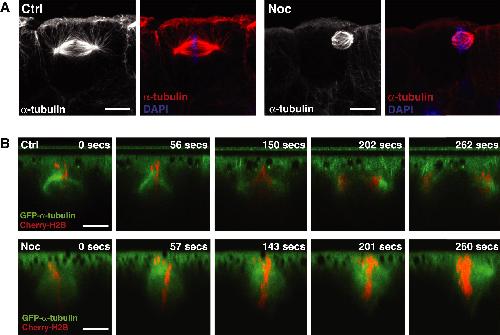 Figure 3. Treatment with Low-Dose Noc Specifically Disrupts Astral Microtubules and Causes Spindles to Reposition Apically(A) Spindles in control (Ctrl) versus Noc-treated embryos; treatment with Noc eradicates astral microtubules that are seen in Ctrl spindles and causes spindles to move to the apical cell surface.(B) Stills taken from Movie S3, showing spindles in Ctrl and Noc-treated embryos. The Noc-treated spindle moves toward the apical cell surface, whereas the Ctrl spindle remains in a constant position along the apicobasal axis even as anaphase proceeds.Scale bars represent 10 μm. See also Figure S1 and Movies S3 and S4. |