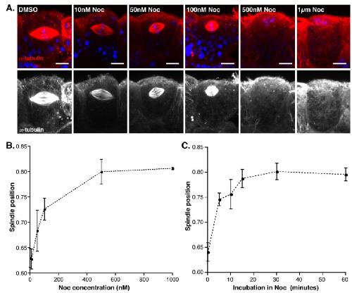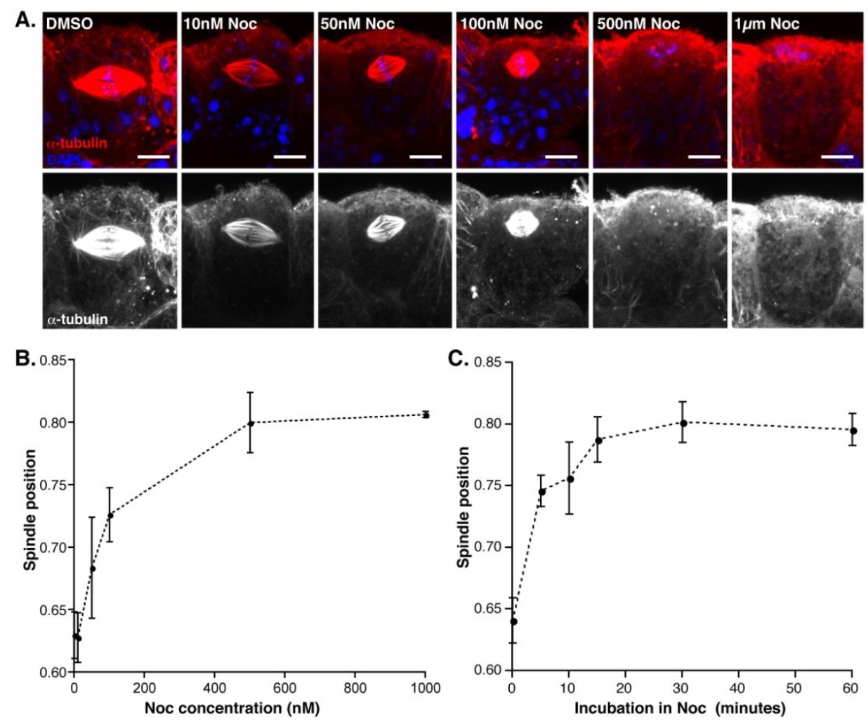 Figure S1, related to Figure 3: (A) Confocal images from embryos incubated in a concentration gradient of nocodazole (Noc) from 10nM to 1μM. Spindles reposition more apically as Noc concentration increases and microtubules are lost. In 500nM and 1μM Noc, spindle microtubules are lost and condensed chromosomes are found pressed against the apical cell surface. Scale bars represent 10μm. (B) Quantification of spindle position in Noc concentration gradient (error bars represent standard error of the mean, n = 3 independent experiments from a total of 13-18 embryos for each treatment). (C) Quantification of spindle position in a time series experiment, where embryos were incubated in 100nM Noc for varying time periods, from 0 to 60 mins. The average spindle position remained apical in longer incubations, indicating that spindles assembled after the addition of Noc, as well as existing spindles, take up the apical position (error bars represent standard error of the mean, n = 3 independent experiments from a total of 10-18 embryos for each treatment). |