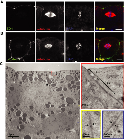 Figure 2. Spindle Position Does Not Correspond to Cell-Cell Junction Location(A) Immunofluorescence for ZO-1 (green), a component of tight junctions, shows that spindle position does not correlate with the location of tight junctions.(B) β-Catenin (green), a component of adherens junctions, is localized all around the basolateral cell surfaces.(C) Transmission electron micrographs (zoomed-in areas highlighted in red, yellow, and blue boxes) show that tight junctions (TJ) and the zona adherens (ZA) are located apically and stretch no more than 2.5 μm down from the apical cell membrane (red box), whereas regions of high density, which may be cell-cell contacts (yellow and blue boxes; arrows), are found at random positions around the basolateral membranes.Scale bars represent 10 μm in (A) and (B) and are as displayed in (C). |
