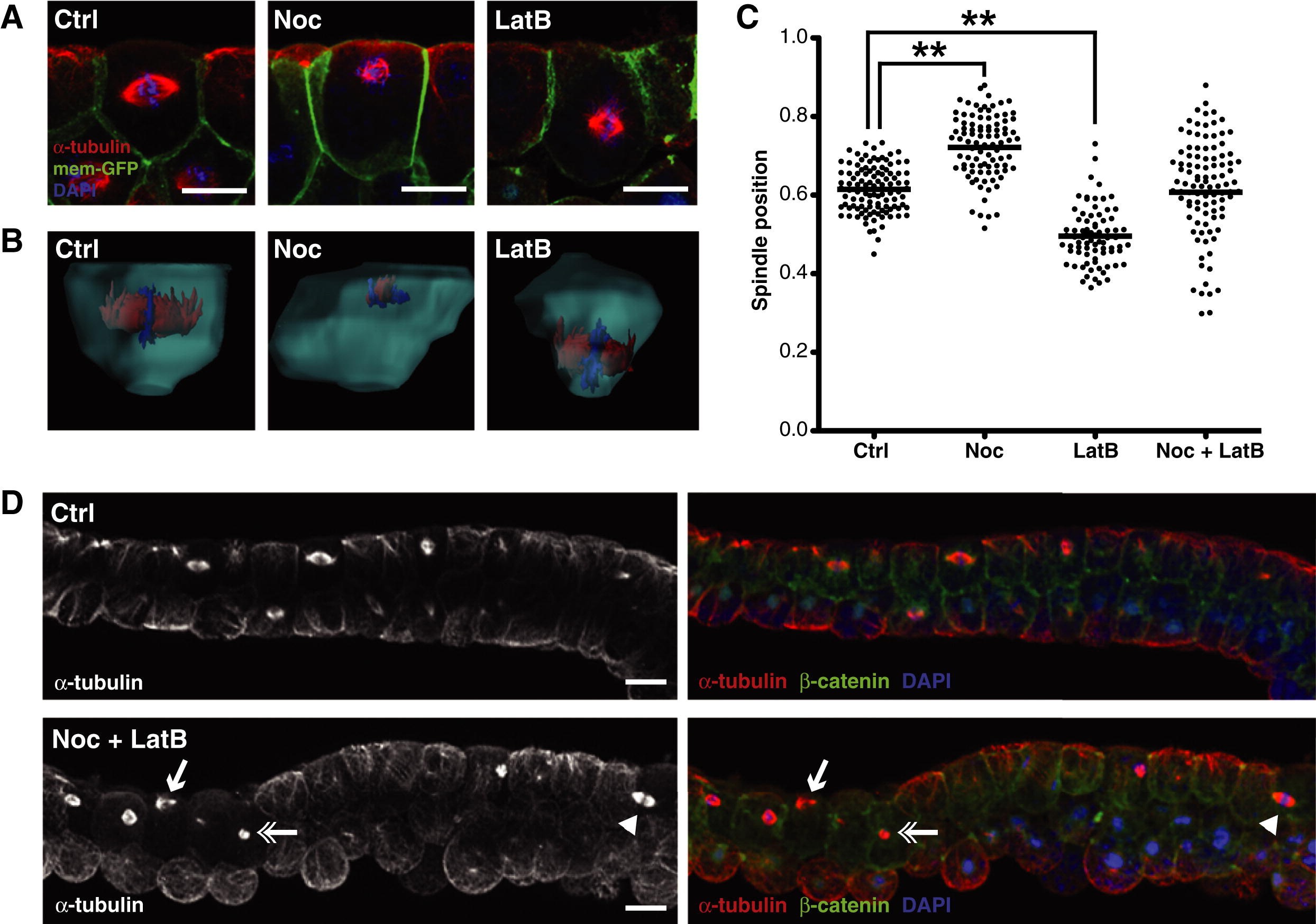 Figure 4. Disruption of Astral Microtubules and Actin Filaments Has Contrary Effects on Spindle Position(A) Side-view immunofluorescent images of spindles in control (Ctrl), Noc, and LatB-treated embryos. Treatment with low-dose Noc causes spindles to move toward the apical cell surface, whereas spindles in LatB-treated embryos move toward the basal surface.(B) 3D reconstructions of individual cells from the epithelium of Ctrl, Noc, and LatB embryos.(C) Quantification of spindle position in Ctrl, Noc, LatB, and Noc + LatB-treated embryos; each dot represents the position of a single spindle. Note that in double-treated embryos the spread of spindle position data are much greater than in either single treatments or control. For significance testing, unpaired Student's t tests were performed (n = 3 independent experiments, from a total of 19, 18, 16, and 16 embryos for Ctrl, Noc, LatB, and Noc + LatB, respectively; ∗∗p < 0.01).(D) Immunofluorescence images of Ctrl and Noc + LatB-treated embryos. In double-treated embryos, spindles are seen randomly positioned along the apicobasal axis, with spindles seen at the apical surface (arrow), basal surface (arrowhead), and center of the cell (double arrow).Scale bars represent 20 μm. See also Figure S2. |